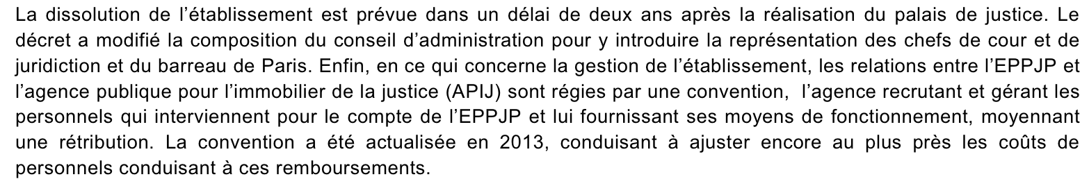Autre bizarrerie, le suivi de ce chantier et de ce dossier n’est pas effectué directement par le ministère, mais par un « Etablissement public du palais de justice de Paris » (EPPJP), créé en 2004, qui coûte environ trois millions d’euros par an et emploie 12 personnes, ainsi qu’on le lit sur ce document budgétaire officiel.
