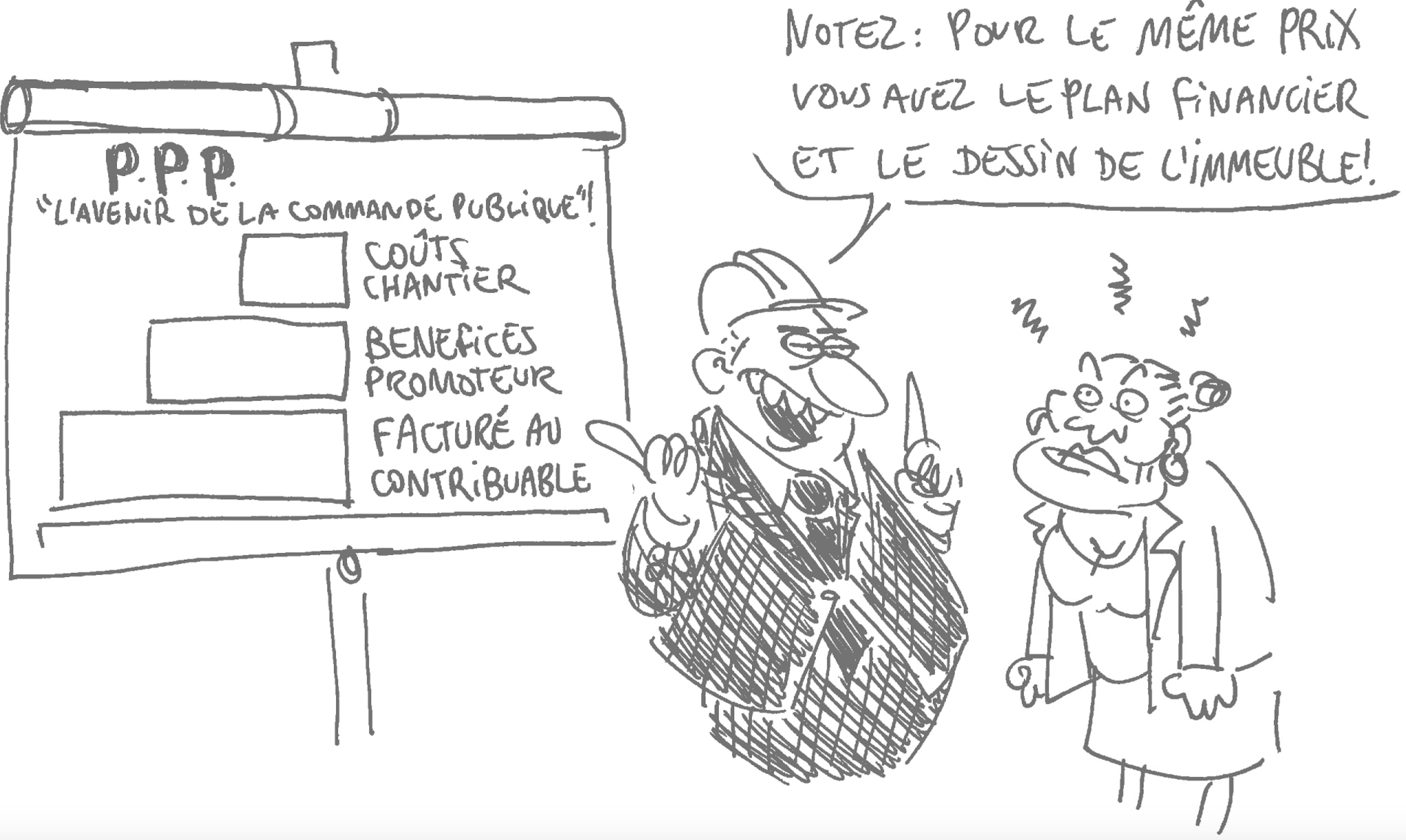 Ce contrat a été de plus conclu sous la forme d’un « partenariat public-privé », une étrangeté très utilisée récemment par la France et que d’aucuns voient en elle-même comme une entourloupe. Officiellement, l’Etat ne dépense pas et ne s’endette pas, car il confie la construction d’un équipement à une société privée. En réalité, c’est une traite tirée sur l’avenir car en retour, cette société lui fait payer une sorte de loyer qui comprend l’entretien, ses charges et le remboursement de son investissement, le tout dans une grande opacité.