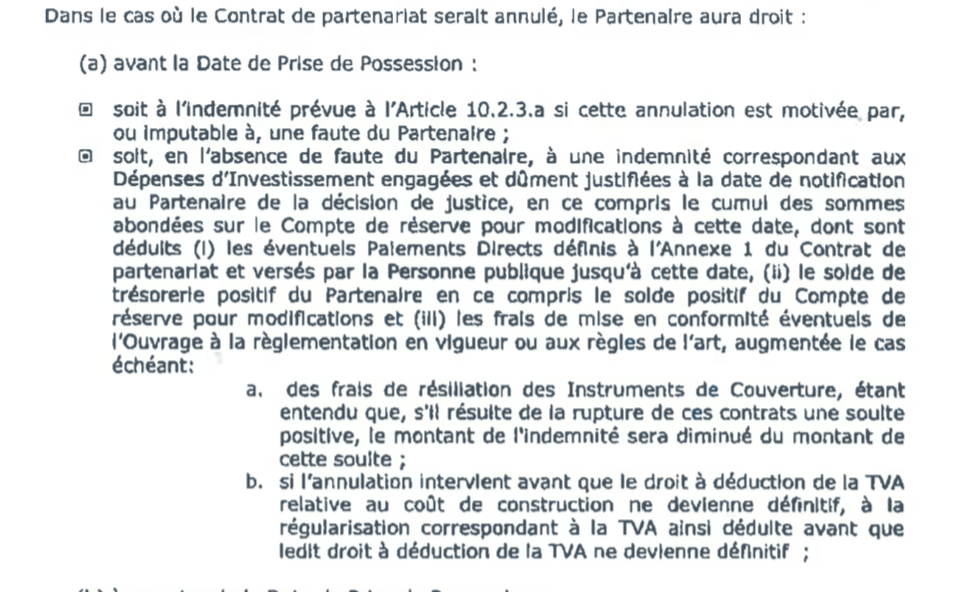 Pour tenter de répondre à cette question, Crocs de boucher est d’abord allé chercher le Contrat de partenariat EPPJP (1). C’est un document technique et un peu aride, dissimulé au public jusqu’à une contestation du projet en justice en 2013-2014, et ensuite remis avec – c’est curieux – de nombreuses parties occultées. On ne parvient pas à savoir d’emblée combien tout cela coûte et il n’est donc pas étonnant que le ministère ait du commander une étude pour calculer en 2012 le chiffre de 2,7 milliards. Tout ce qui concerne les pénalités à payer par l’Etat en cas d’annulation du projet est particulièrement tortueux, comme on le lira par exemple ici.