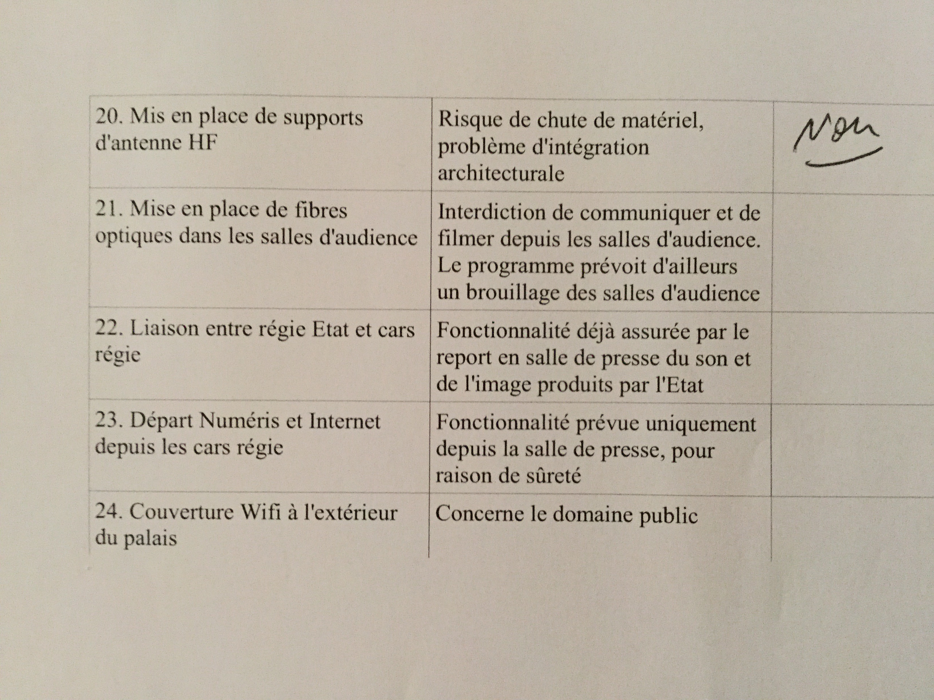 1. Le bureau de la presse judiciaire a rencontré la DSJ cet aprème et ils ont promis de renoncer au brouillage, et d’engager des discussions sur le reste (accessibilité et places pour la presse). Amusant le palais de justice du XXIe siècle