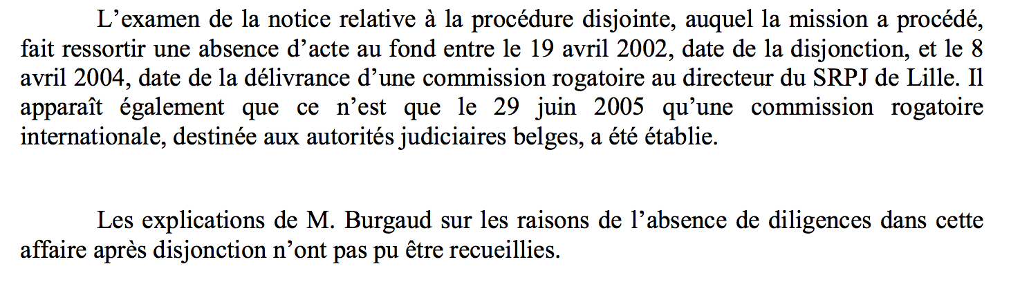 Cette attitude est d’autant plus troublante qu’en 2002, Burgaud a par ailleurs disjoint dans une autre information judiciaire l’enquête sur un meurtre d’enfant imaginaire inventé par Daniel Legrand. Ce dernier avait tenté au printemps 2002, par cette méthode certes discutable, de faire apparaître l’incongruité de ce dossier qui crevait pourtant les yeux. Peine perdue, Burgaud et les autres ont oublié ce nouveau dossier dans un placard après un cirque de vaines fouilles avec engins de chantier à Outreau. L’Inspection documente cet autre « oubli » qui ne prendra fin que quand le scandale aura éclaté, en 2005.