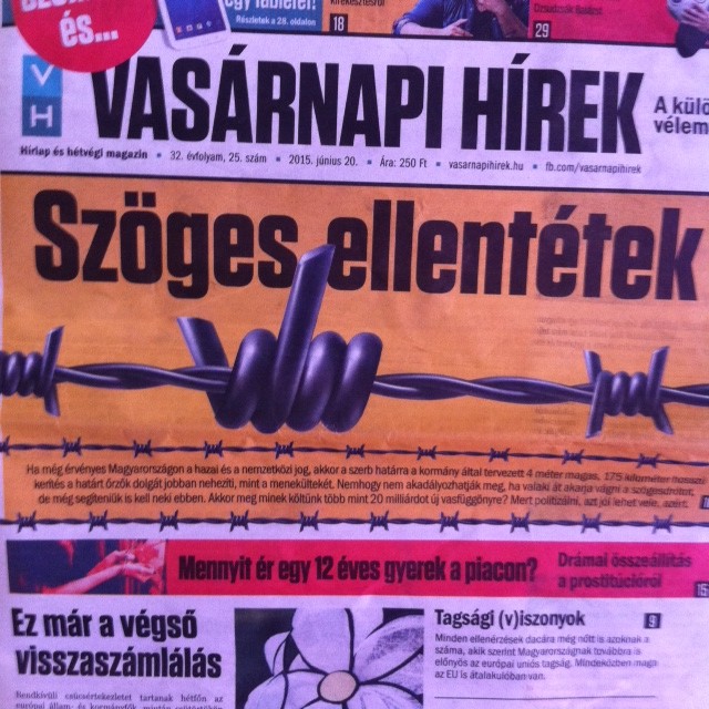 Dans la presse hongroise de gauche, le mot a aussitôt resurgi : « vasfüggöny », « rideau de fer ». Les caricaturistes n’ont pu qu’exprimer de manière très directe leur aversion à l’idée de nouveaux barbelés, comme dans le Vasarnapi Hirek, « Nouvelles du dimanche », qui se livre ici à un jeu de mots intraduisible sur les « oppositions acérées » que suscite le projet.