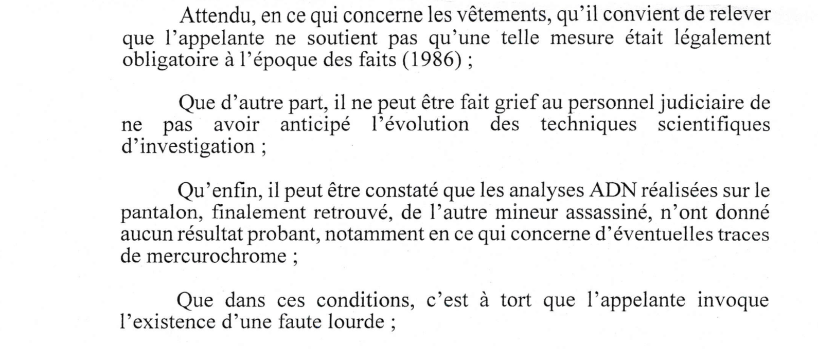 La non-conservation des vêtements ? Pas de problème, dit la cour d’appel dans son arrêt du 21 mars 2011. On ne pouvait pas savoir que ça pouvait servir. D’ailleurs, un pantalon retrouvé des décennies plus tard, n’a pas « parlé », c’est bien la preuve que tout ça n’aurait servi à rien.