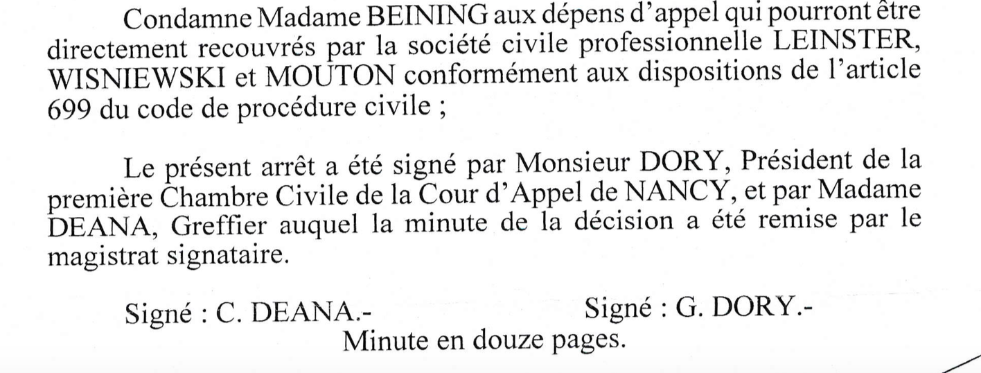 Donc, dit en substance la cour : circulez, il n’y a rien à voir. Et pour faire bonne mesure, on va désigner – contrairement au jugement de première instance – un huissier pour faire passer le goût à Chantal Beining de venir critiquer les magistrats.