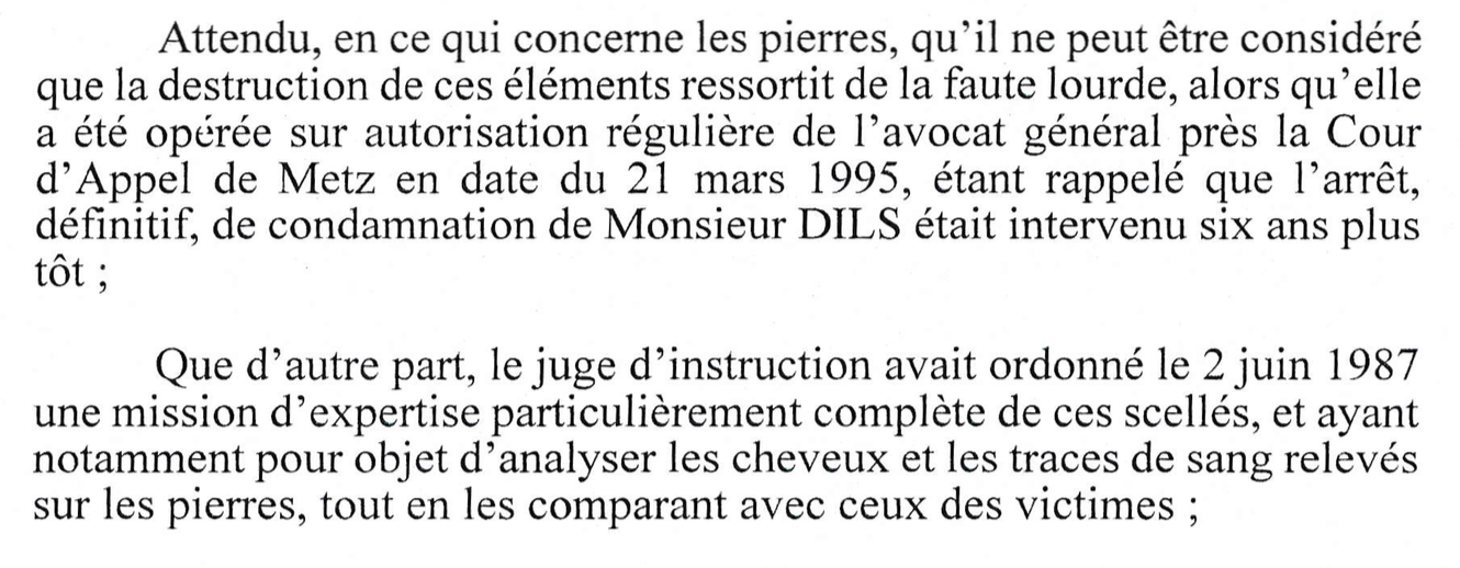 D’abord, les vêtements des deux enfants victimes n’ont jamais été placés sous scellés et donc expertisés sérieusement, ce qui a rendu impossible plus tard les recherches d’empreintes génétiques. Le parquet général de Metz a même été jusqu’à faire détruire toutes les autres pièces à conviction, dont les pierres ayant servi au crime, en 1995 et ce alors que Dils avait déjà multiplié les demandes de révision et demandes de grâce.