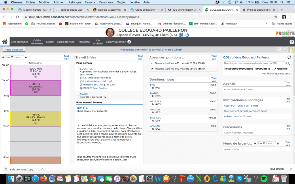 Au collège Pailleron, où seuls quatre des onze enseignants de ma fille de 13 ans ont utilisé l’ENT pour envoyer des devoirs (les autres sont pour l’instant aux abonnés absents), l’événement est pourtant survenu. Un professeur d’espagnol est allé chercher je ne sais où une application (chacun sait que tout cela est disponible librement partout) et il a fait cours jeudi pratiquement normalement, avec quasiment toute la classe.