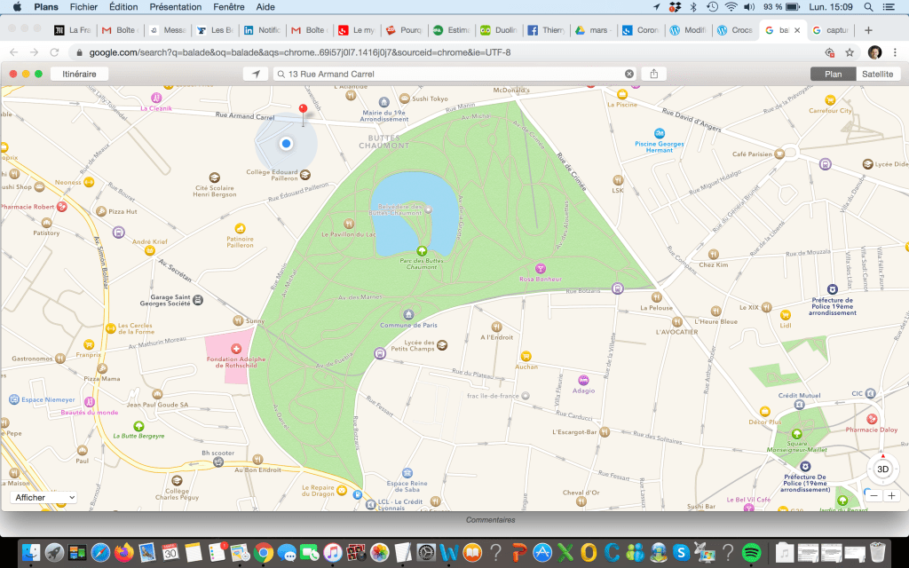 C’est le jour de la balade réglementaire pour « activité physique individuelle des personnes », avec certificat en règle (on prend vite l’habitude des obligations empruntées pour la cause sanitaire aux régimes totalitaires). Pour moi ça s’effectue suivant mon itinéraire désormais rituel, autour du parc des Buttes-Chaumont, une quarantaine de minutes pour un voyage à pied à petite allure, visite fulgurante à la société de ce moment étrange du Covid-19. Situons-nous un peu en regardant la carte ci-dessous.