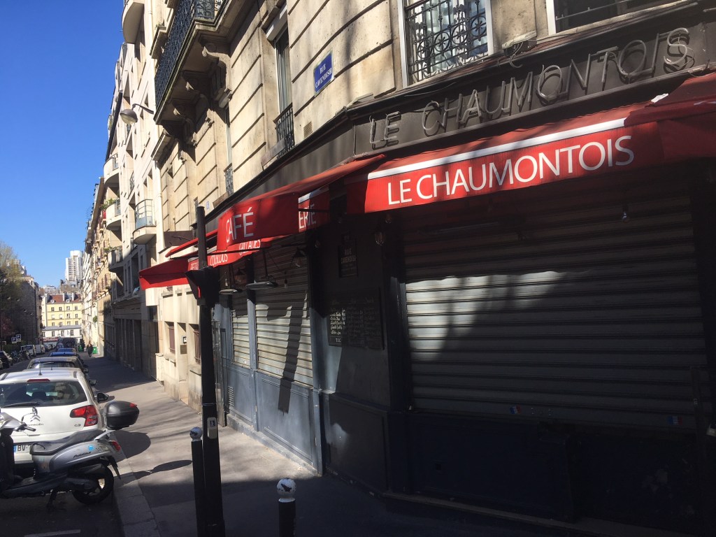 En face de chez moi, rue Armand Carrel, c’est le « Chaumontois », un bar de Kabyles qui nous manque, à nous. On allait prendre le café le moins cher de Paris, et le vendredi, il y a moules-frites gratuites (la gratuité est une incongruité à Paris, eh ben ici, ça existe, monsieur). Surtout, ils ont Canal+ et avec les enfants, nous allions souvent manger un couscous à 11 euros , devant l’affiche de la journée de Ligue 1, en écoutant beugler les gens du comptoir. Pourvu qu’ils reviennent et qu’ils puissent rouvrir.