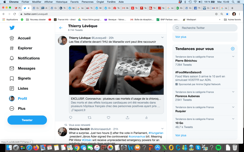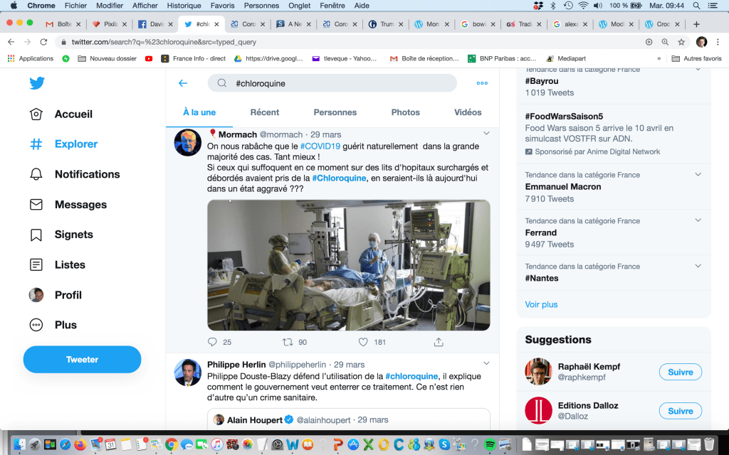 J’avoue, j’ai polémique sur la chloroquine, sujet favori de l’éther informatique depuis qu’un scientifique marseillais, Didier Raoult, a prétendu avoir découvert que ce médicament était un remède contre le Covid-19. D’autres scientifiques pensent que ses essais, dont il a retiré les morts et les disparus et à côté desquels il a « oublié » d’adosser un groupe-témoin de patients ne prenant pas de chloroquine, ne valent rien ou pas grand-chose.