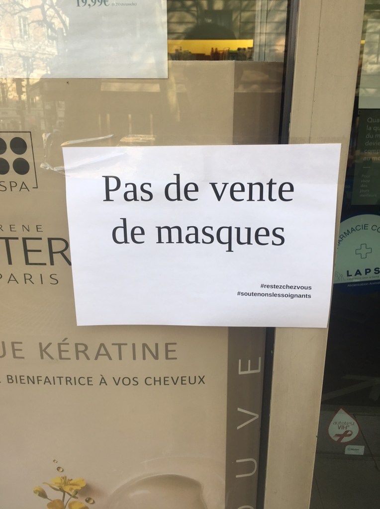 Les pharmacies du quartier, comme celle de la rue Carrel, ne délivrent en tous cas aucun masque, ni médical, ni artisanal, et le font savoir.
