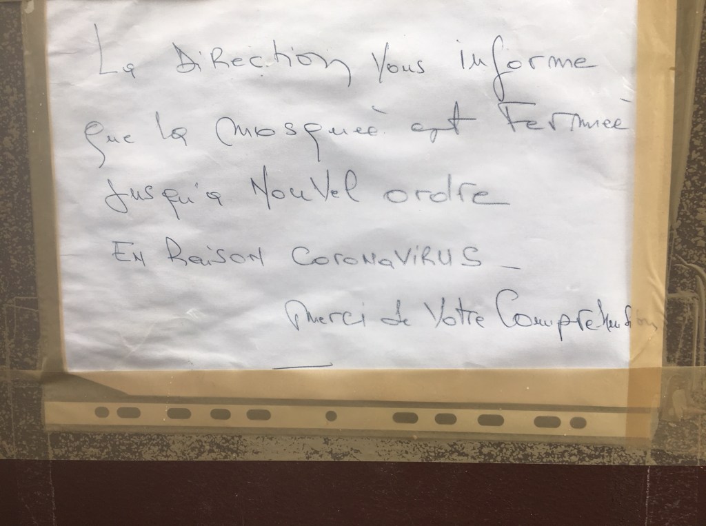 C’est ainsi qu’à la mosquée Adda’wa (L’Invitation), rue de Tanger derrière le bassin de la Villette, à 15 mn à pied de ma taule, on trouve porte close et cette affichette. Il n’y a pas eu de prière du vendredi depuis plusieurs semaines, ni rien d’autre.