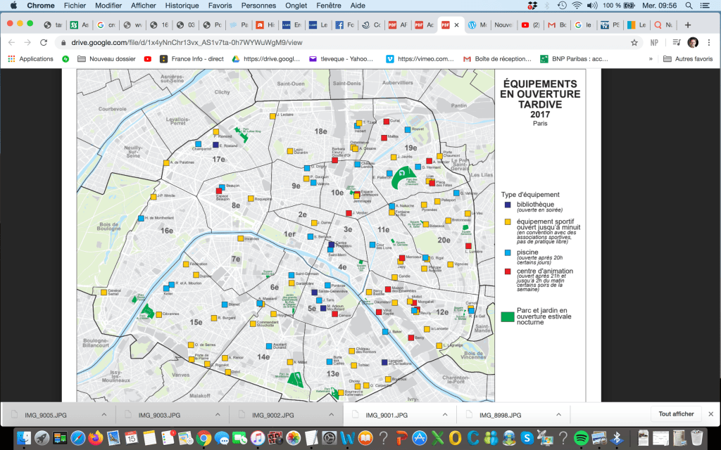 La Ville de Paris s’était intéressée au sujet en 2010 lors d’un colloque, mesurant que sa nuit pesait 1,4 milliard d’euros de chiffre d’affaires annuel en cabarets, discothèques et autres établissements de nuit (1.600 au total), beaucoup dirigés vers les dizaines de millions de touristes annuels., avec une hôtellerie également à situer dans l’économie de nuit qui pesait 5 milliards. On en avait plus ou moins conclu qu’il fallait étendre encore l’emprise du jour sur la nuit. La carte des équipements municipaux ouverts une partie de la nuit ressemblait à ça.