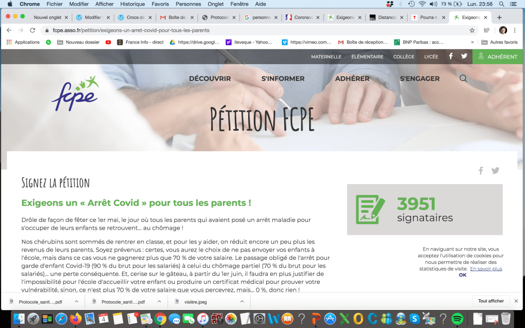 Prenons par exemple cette amusante revendication de la FCPE, la principale organisation de parents d’élèves, qui a lancé une pétition diffusée aussi dans le XIXe. « Nous demandons qu’une prise en charge financière, sans aucune perte de salaire, soit rétablie pour tous les parents qui souhaiteront ou devront s’occuper de leurs enfants jusqu’à ce que la situation sanitaire de notre pays permette un retour à l’école serein, humain et sécurisant ». Il y avait près de 4.000 signataires le 4 mai au soir.