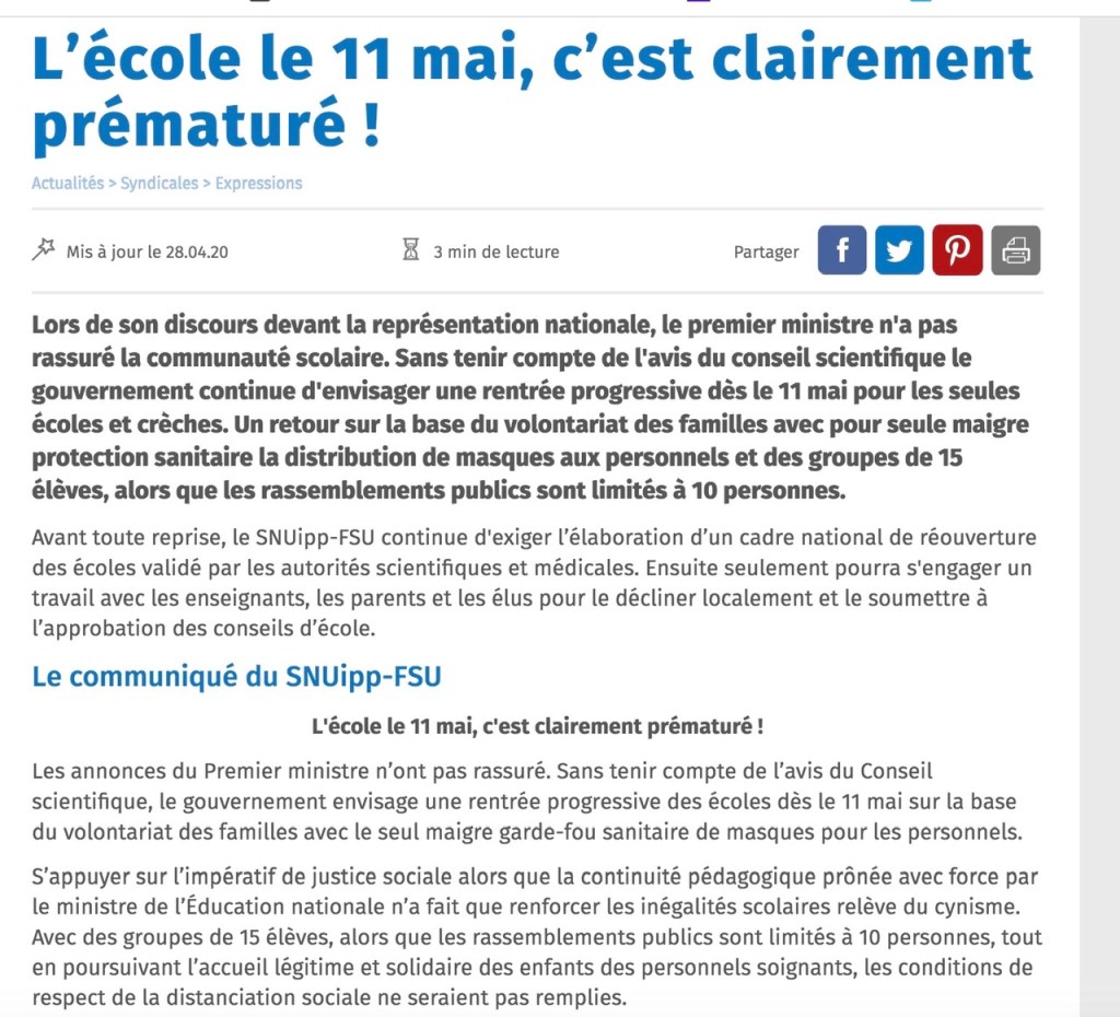 Après l’annonce fin avril par le président Macron d’une rentrée scolaire partielle et progressive le 11 mai, le principal syndicat FSU (version complète ici) a ainsi considéré le 28 avril que cette rentrée serait « prématurée », estimant même que la limitation des effectifs des classes à 15 personnes était excessive. Le syndicat réclamait de les limiter à dix (une pratique qui sera effective ensuite dans certains établissements).