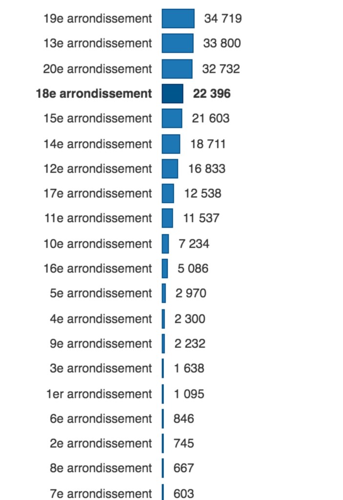 C’est dans l’est de Paris et en Seine-Saint-Denis qu’on clabotait du Covid au printemps, c’est toujours là qu’on va passer l’arme à gauche. D’ailleurs la grande presse a récemment découvert que la maladie frappait davantage les cloches et les smicards que les habitués de l’île de Ré, à travers une étude répercutée par exemple dans Le Monde. Les revenus les plus faibles, les non-diplômés et les immigrés vivent en effet dans les immeubles surpeuplées et les logements exigus, justement une caractéristique du XIXe arrondissement qui a le record de logements sociaux à Paris, comme le montre ce graphique de 2016. C’est tout de suite frappant, il y en a un peu moins dans le VIIIe par exemple. Les petites vieilles en carré Hermès ont moins de souci à se faire, elles ont de la place dans leur logement pour respecter la distance de sécurité avec la bonne philippine.