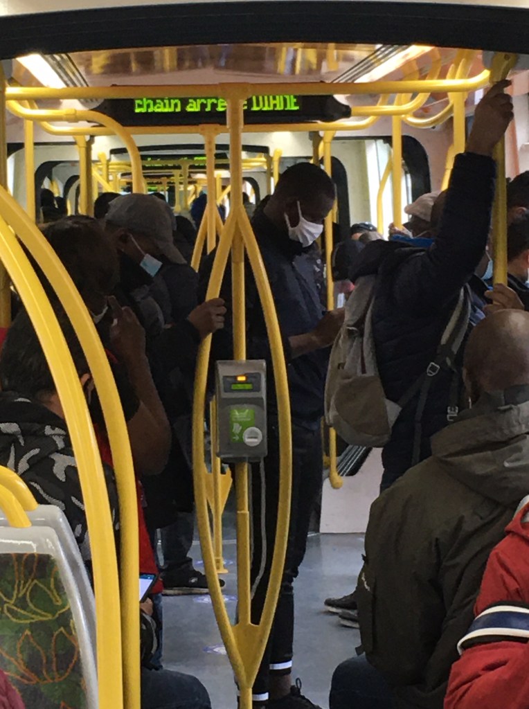 Après cette ruée vers l’arrière, le front du XIXe semblait le lendemain résigné avec encore beaucoup de gens dans les rues et des patrouilles de police et de soldats renforcées (il y a aussi le risque terroriste, qui a amené un déploiement de milliers de soldats supplémentaires sur le territoire). Il n’y avait pas encore de verbalisations, apparemment. Cafés et restaurants ont baissé rideau, les derniers commerces balayaient dans les coins et mettaient les housses sur les rayons avant d’éteindre la lumière pour un mois, ou davantage…. ou pour toujours peut-être si les faillites se multiplient comme on peut le craindre malgré les aides publiques. Pour ceux qui triment à potron-minet et rentrent au milieu de l’après-midi, très exactement sur la ligne 3B du tramway, le front du virus ressemblait à ça :